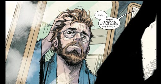 It could’ve started with action, it could’ve started with him as Spider-Man, it could’ve started with him at work. I mean, there’s a million ways it could’ve started, but what Jon decided to do was start in a way where he’s staring into the mirror thinking about his own life and then an assessment of it as he comes out, right? He's looking and talking to all the members of his family and we see that he loves them, he's happy, and yet at the same time he's longing for something and he's going to talk about it later. So for me, the core of what the book is about is there in those first pages. Could you start it with Spider-Man? 100%. It could be better, it could be worse. It's just an execution that we haven't seen. You could do the same thing starting with Spider-Man in some way. You just have to construct a scene that essentially had Spider-Man as this Peter in a position where we understand that he's thinking about his mortality, that he's fighting and never done it before, but he's older. However you do it, it would capture the essence of the book. But what Jon has done here, I think, is really go for the heart, go for the emotional core of what the story is about and put that first. So, first sentence, I do think it's kind of there. First page, I think it's there. First scene, the core of the book is there. That's what it is. It's just doubling down on this sense of this is what this is about.